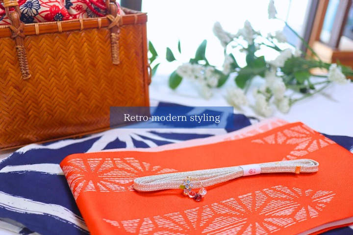 鮮やかなオレンジの帯が映えるコーディネート。