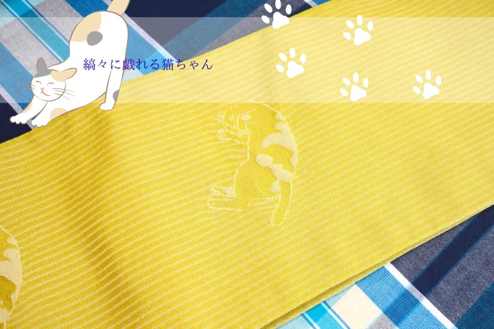 裏面は、元気いっぱいの黄色地に、控えめな織りで猫ちゃんが。