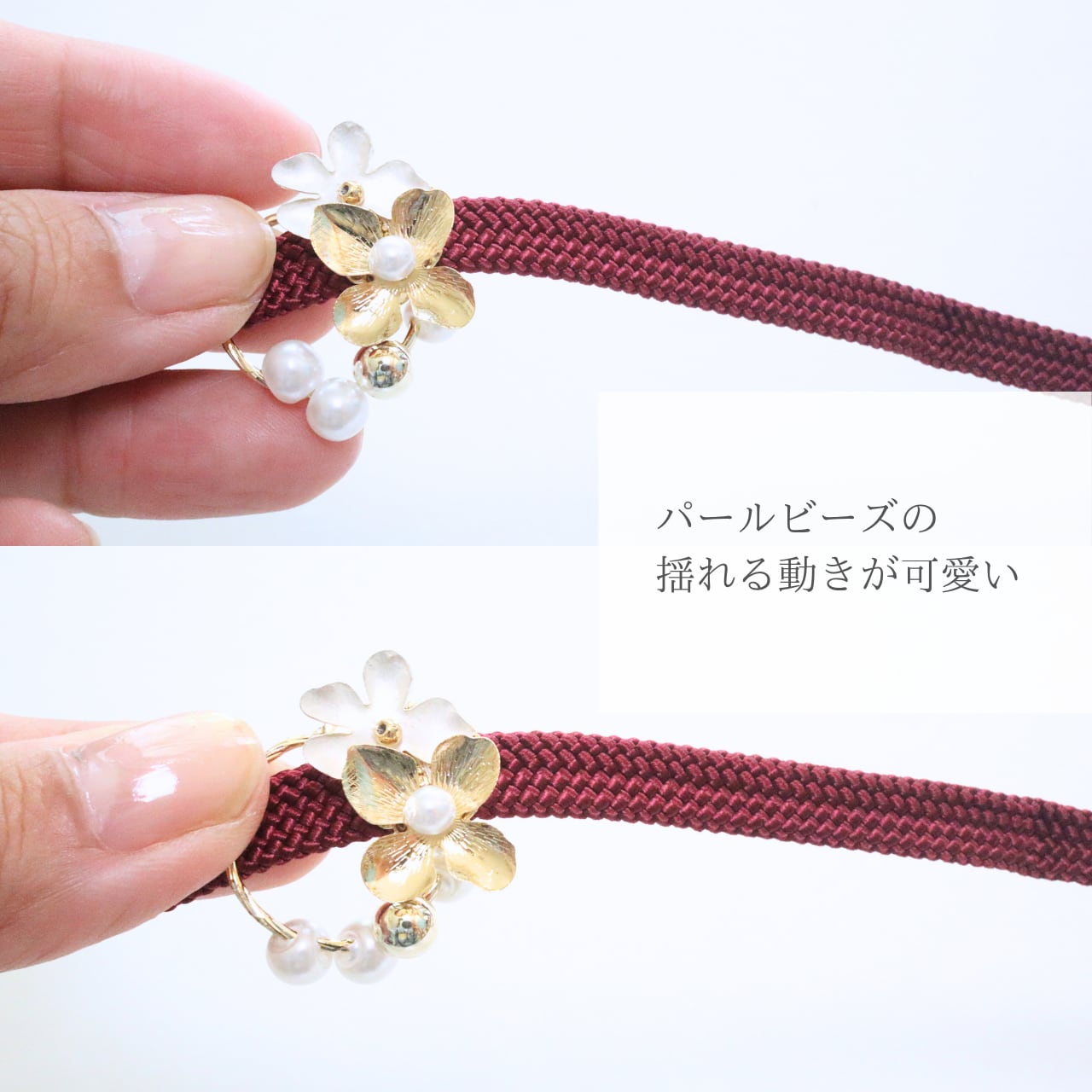 【小花の帯留め 揺れるパールビーズ】