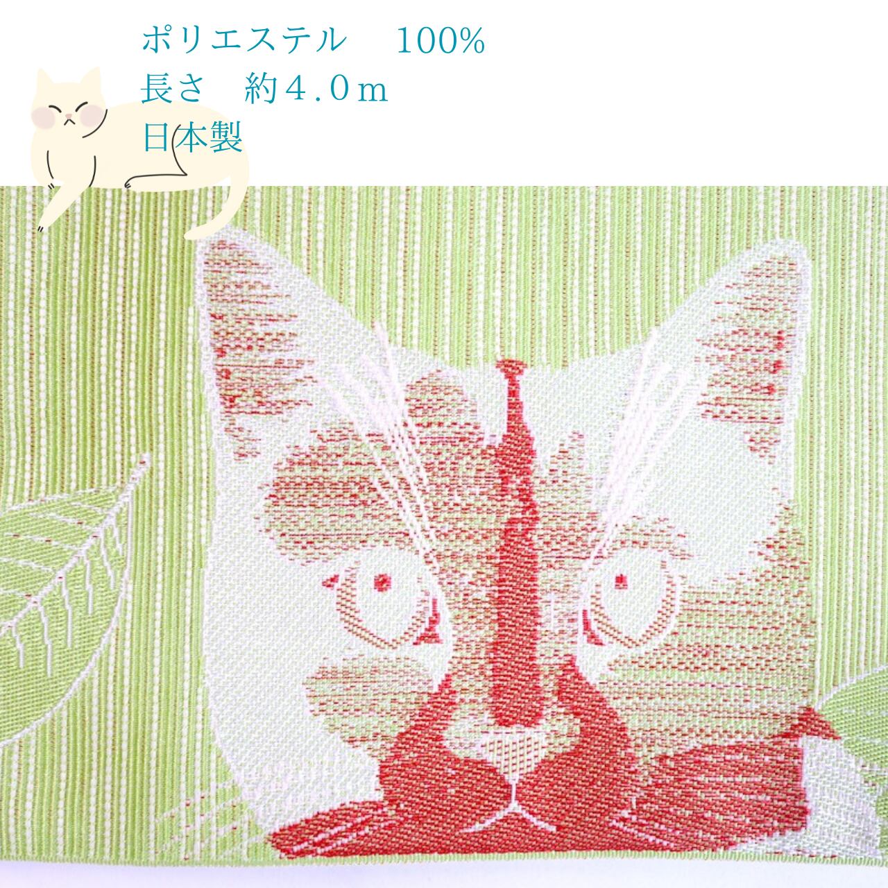 【半巾帯】猫ちゃん お顔葉っぱと黄緑色×ゴロンとする猫ちゃんと山吹色 リバーシブル 約4.0m